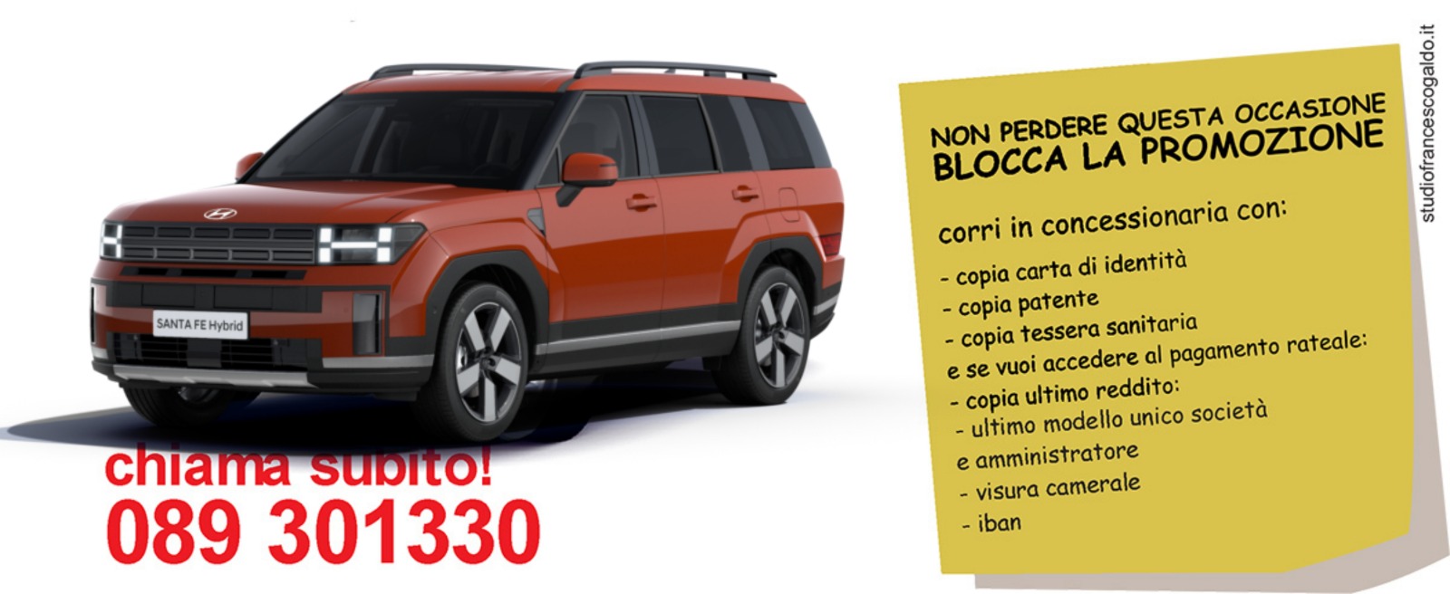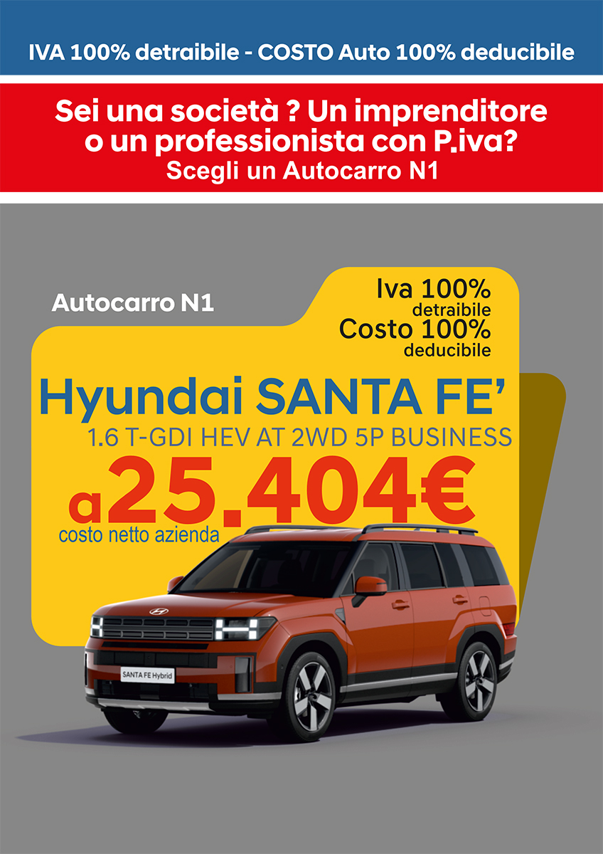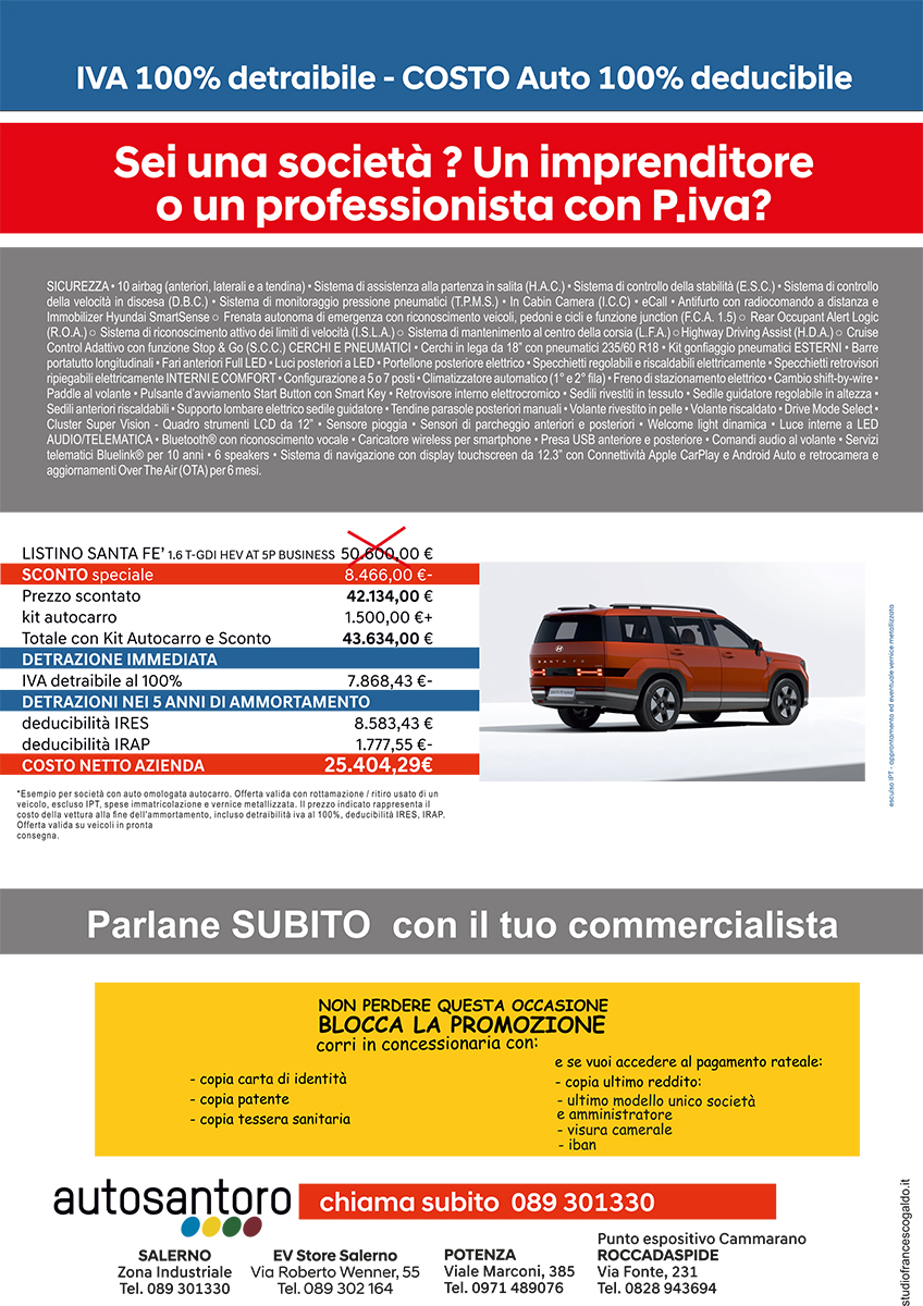 Gamma Kona: motore benzina 1.0 T-Gdi 100cv benzina consumi l/100km (ciclo combinato ) da 5,6 a 6,0. Emissioni C02 g/km da 128 a 137 ciclo medio combinato. Dati di consumo e di emissione di anidride carbonica secondo le prescrizioni del Regolamento UE 2017/1347 AG. I dati sono calcolati secondo il nuovo ciclo diprova WLTP. Prezzo promo riferito a Nuova Kona 1.0 T-GDI Benzina Xtech 100cv, esclusi IPT, PFU, vernice met o vernice pastello speciale e oltre oneri finanziari e assicurativi. La foto dell'auto rappresentata ha degli accessori a pagamento.Offerta valida solo in caso di rottamazione (intestato alla stessa persona che intesta la vettura nuova oppure ad un familiare appartenente allo stesso stato di famiglia attuale o storco con detenzione minima di 6 mesi e solo con finanziamento Gold all inclusive con contestuale acquisto del pacchetto 6 anni furto totale parziale incendio rapina ed infortunio al conducente e 5 tagliandi ogni 15.000km o 1 anno ed immatricolazione veicolo nuovo entro fine mese. Promo GPL OMAGGIO solo in caso di finanziamento All Inclusive oltre oneri finanziari, assicurativi e di manutenzione. La foto dell'auto rapprensentata ha degli accessori. Annuncio pubblicitario con finalit� promozionale. Salvo approvazione societ� finanziaria Hyundai Capital Bank. Per le informazioni precontrattuali e per conoscere le condizioni economiche dell'offerta si rinvia al documento informazioni Europee di base sul credito ai consumatori (SECCI) che potr� essere richiesto sul punto vendita unitamente a copia del testo contrattuale li differimento della prima rata di rimborso non genera interessi n� costi aggiuntivi a carico del cliente. Offerta soggetta a limitazioni. Per la formula Autosantoro 6+5 senza anticipo TAN 7.90% (tasso fisso) TAEG 9.50% (tasso fisso) con Polizza furto incendio e rapina con furto totale e parziale a premio unico 6 anni inclusa nel piano finanziario tariffa per Salerno, Potenza e Avellino. Dettagli offerta in concessionaria oppure su www.autosantoro.it. Esempio rappresentativo di finanziamento con la formula Autosantoro 6+5 A due velocit� 24 mesi +72 mesi oppure 24+60 mesi oppure 36 mesi + 48 mesi. Prezzo di Listino 26.700�, prezzo promo 20.900� con maxi rottamazione e finanziamento gold con contestale acquisto del pacchetto assicurativo per 6 anni con furto totale, parziale, incendio, rapina ed infortunio al conducente e 5 tagliandi ogni 15.000km o 1 anno, con uno sconto totale di 5.750�. Prezzo senza finanziamento e senza contestuale acquisto del pacchetto assicurativo furto totale furto parziale incendio rapina ed infortunio al conducente 22.450� con maxi rottamazione. Spese comprese nel costo totale del credito: polizza furto incendio, a richiesta la polizza rc, interessi, istruttoria, incasso rata, produzione e invio lettera conferma contratto; comunicazione periodica annuale; imposta di bollo. A richiesta Creditor Protection lnsurance (Polizza Credit Life - contratto di assicurazione vita, inabilit� totale temporanea e permanente. Prima della sottoscrizione leggere il fascicolo informativo, disponibile sul sito internet. Offerta valida solo in caso di rottamazione (intestato alla stessa persona che intesta la vettura nuova oppure ad un familiare appartenente allo stesso stato di famiglia attuale o storco con detenzione minima di 6 mesi e solo con finanziamento Gold all inclusive con contestuale acquisto del pacchetto 6 anni furto totale parziale incendio rapina ed infortunio al conducente e 5 tagliandi ogni 15.000km o 1 anno ed immatricolazione veicolo nuovo entro fine mese. Solo per auto in pronta consegna. Dettagli in sede e su www.autosantoro.it. Salvo errori e omissioni